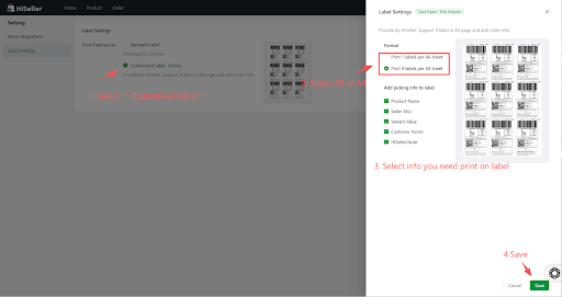 2. Select “Customized Label”, select the format based on whether your printing paper is A4 or A6, check the product information you want to print on the label, and then click Save.