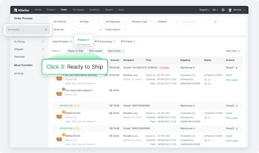 In the In Process - Printed tab, select orders and click [Ready to Ship].