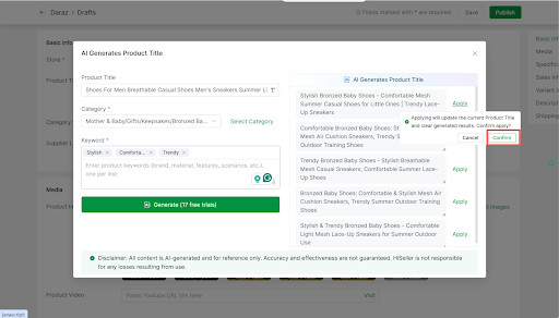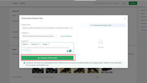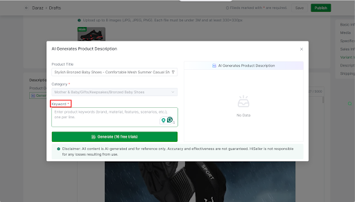 HiSeller’s AI Title & Description Generator creates product titles and descriptions based on your item details, aligned with platform search guidelines and local user search preferences.