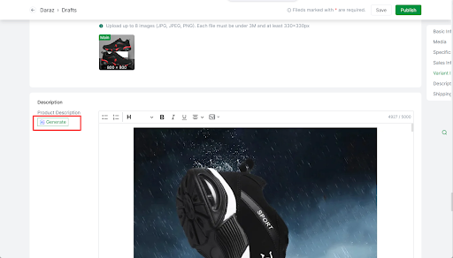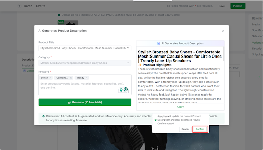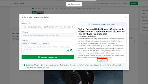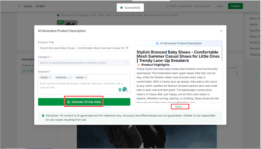 Click the AI Generate button >> Enter the keyword >> Select Generate (20 free trials per day)>> Apply the AI-generated product description to your product description