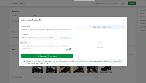 Click the AI button >> Enter the keyword >> Select Generate (20 free trials per day)>> Apply the AI-generated product title to your product title