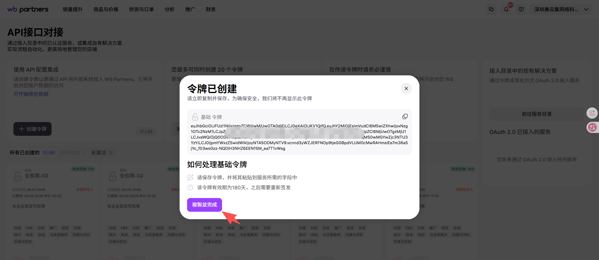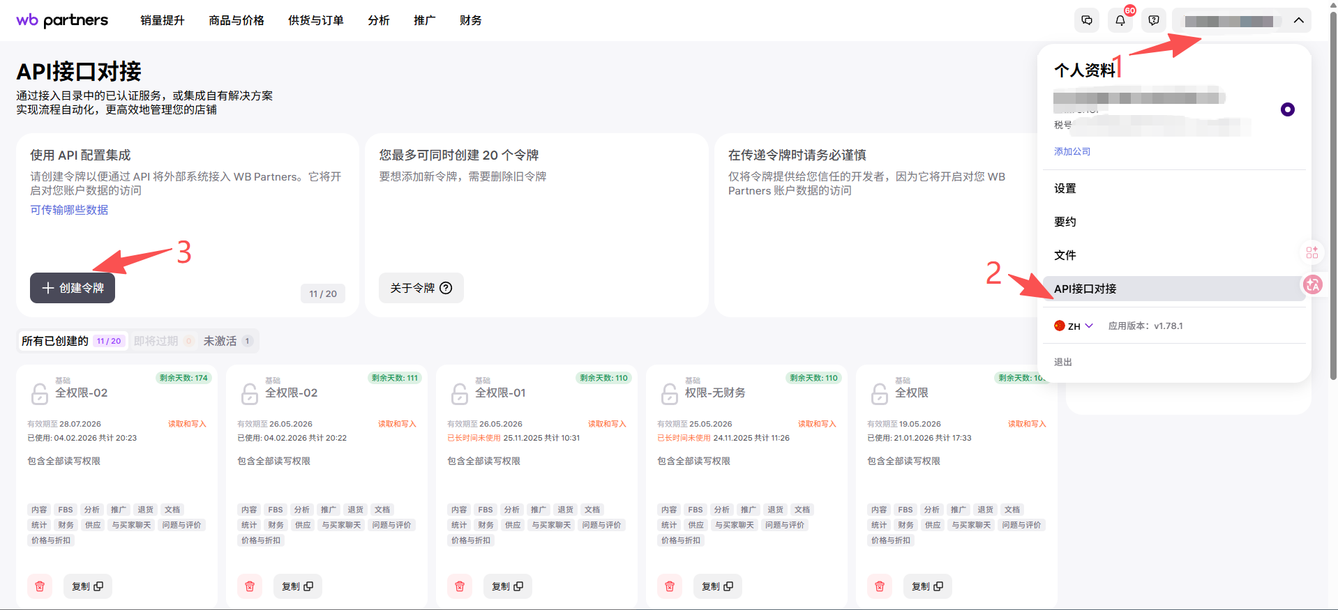 第一步:【登录野莓(Wildberries)后台—右上角账号信息—API集成—创建令牌—自定义令牌名称—访问部分注意全部选择—将生成的Token信息复制到HiSeller页面】