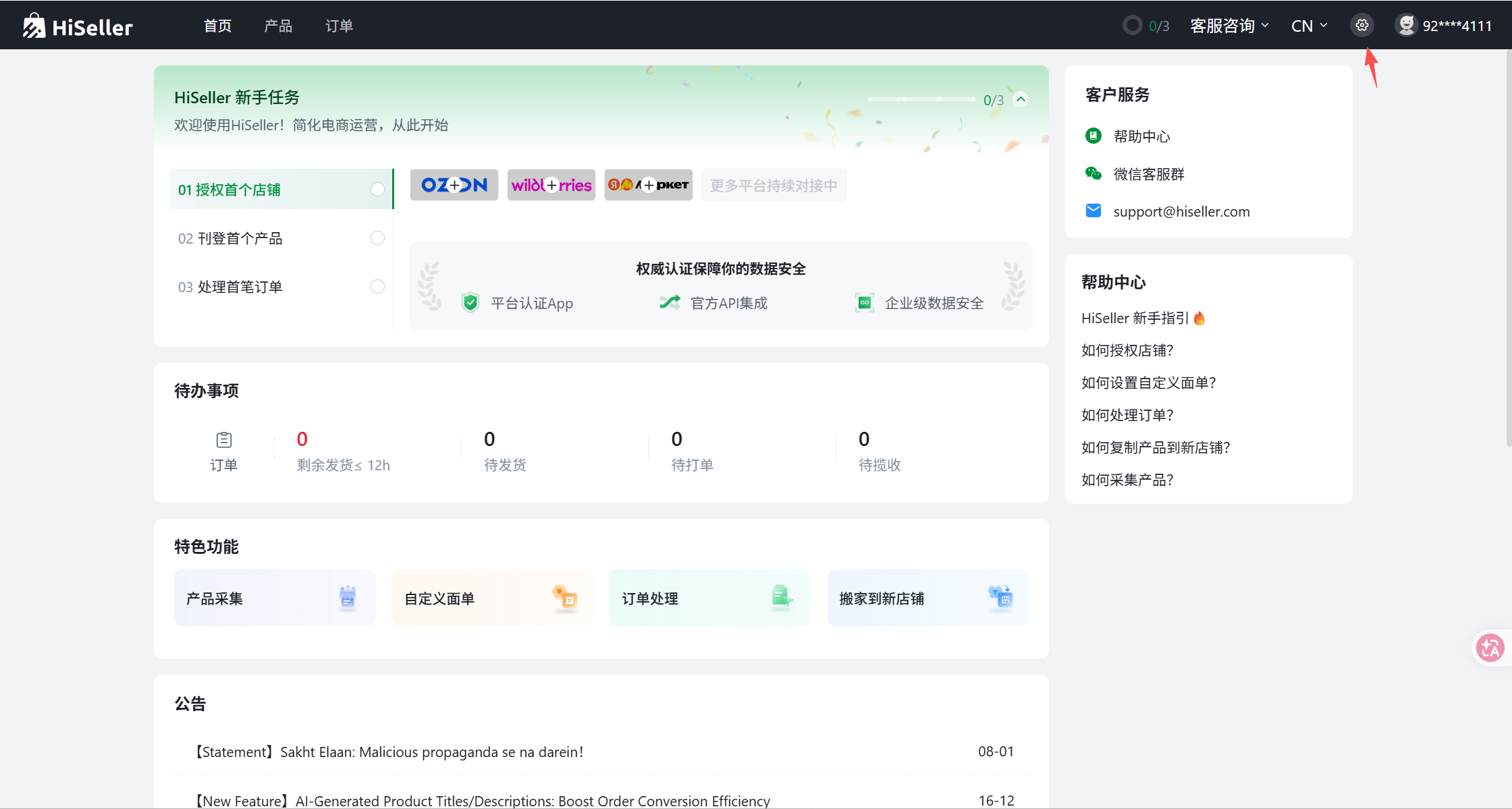 第一步:进入 HiSeller 主页,点击左侧「设置」选项