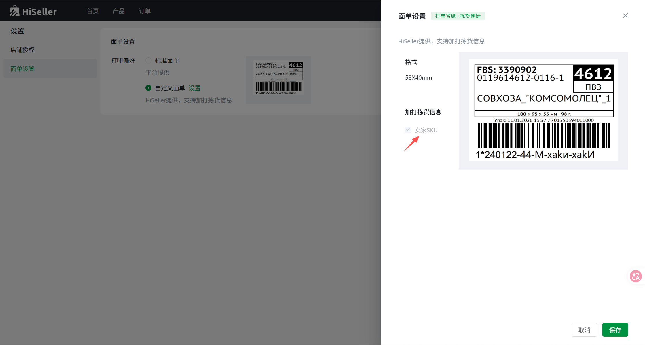 第四步:点击「设置」,在自定义设置界面中,勾选「显示 SKU」选项,保存设置;后续打印 FBS 订单贴纸时,SKU 会自动显示在面单上,方便仓库拣货核对。