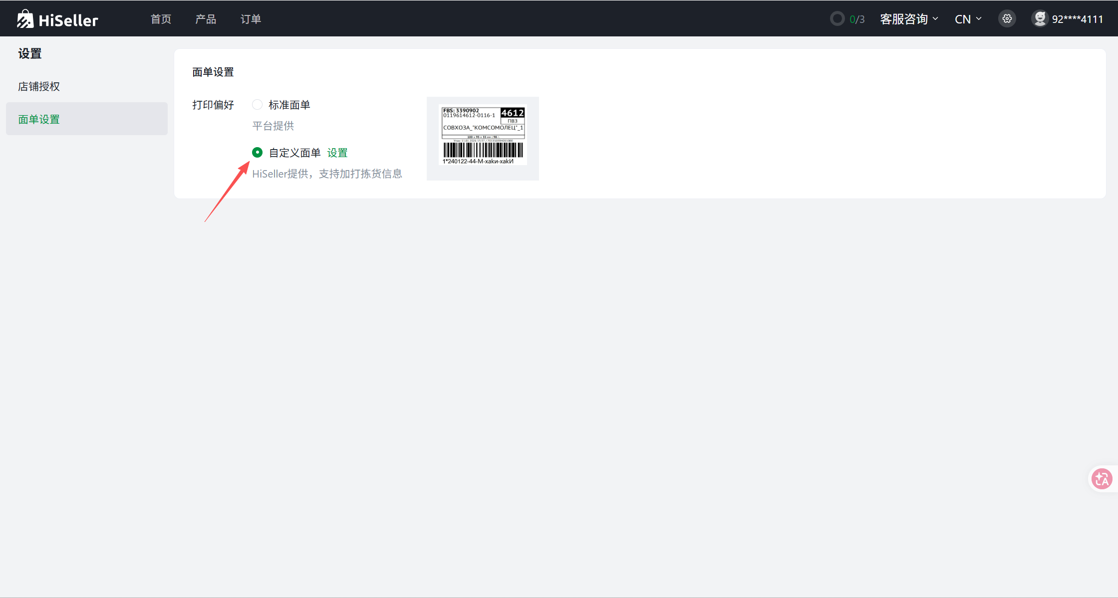 第三步:在面单设置页面,选择「自定义面单」选项