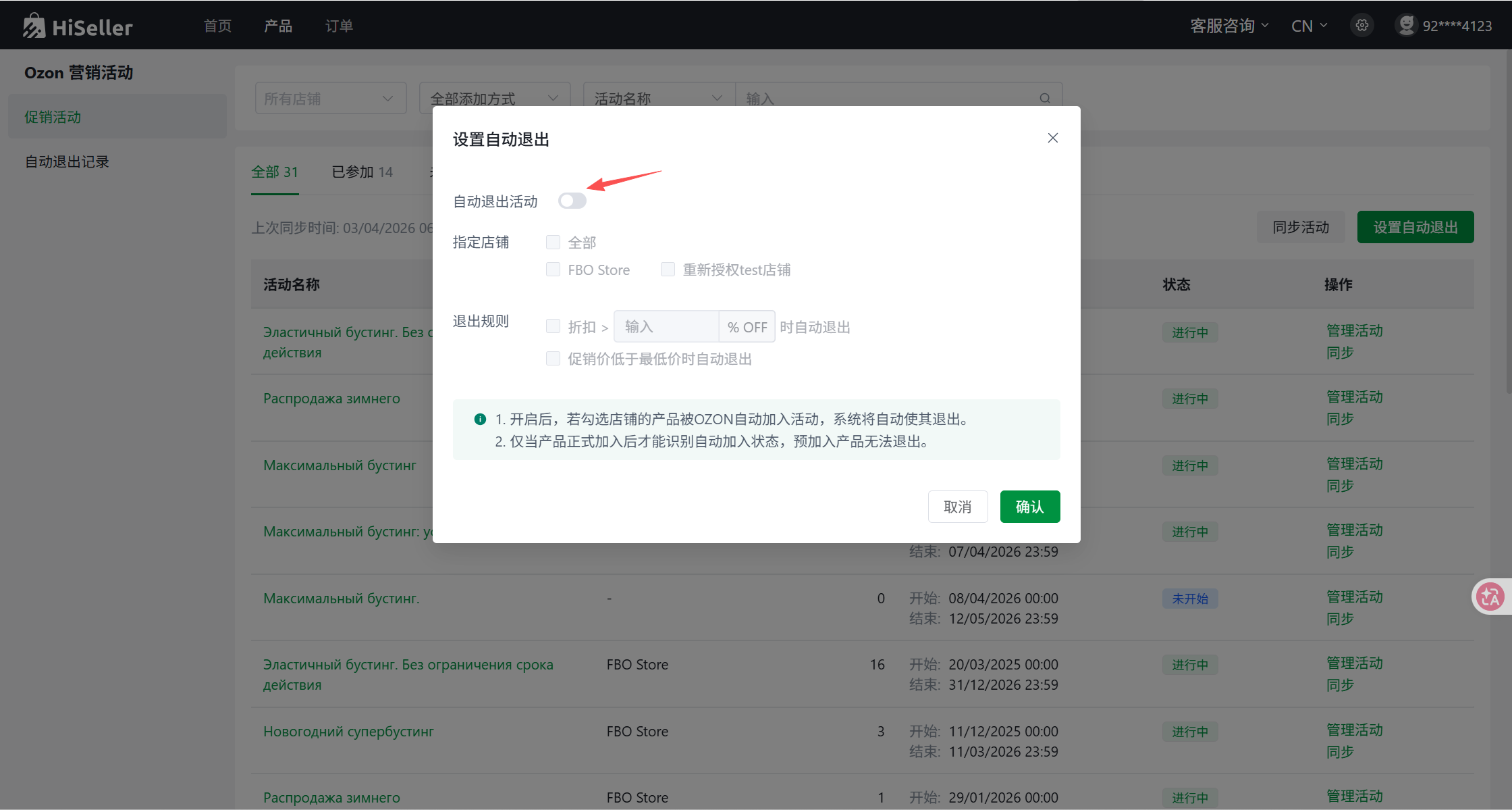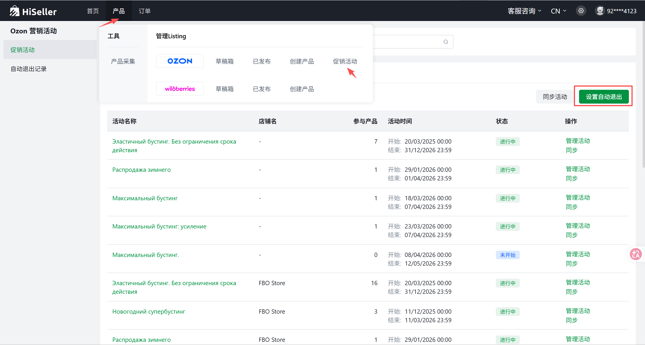 1.前往 HiSeller 平台的 Ozon 促销活动列表,选中需要配置的活动,然后点击“设置”按钮。