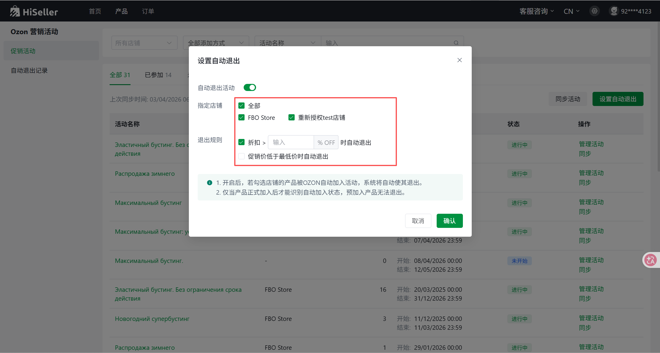 3.配置触发规则:选择适用该规则的店铺,并设定退出条件(例如:折扣力度过大,或售价低于预设的最低价)。